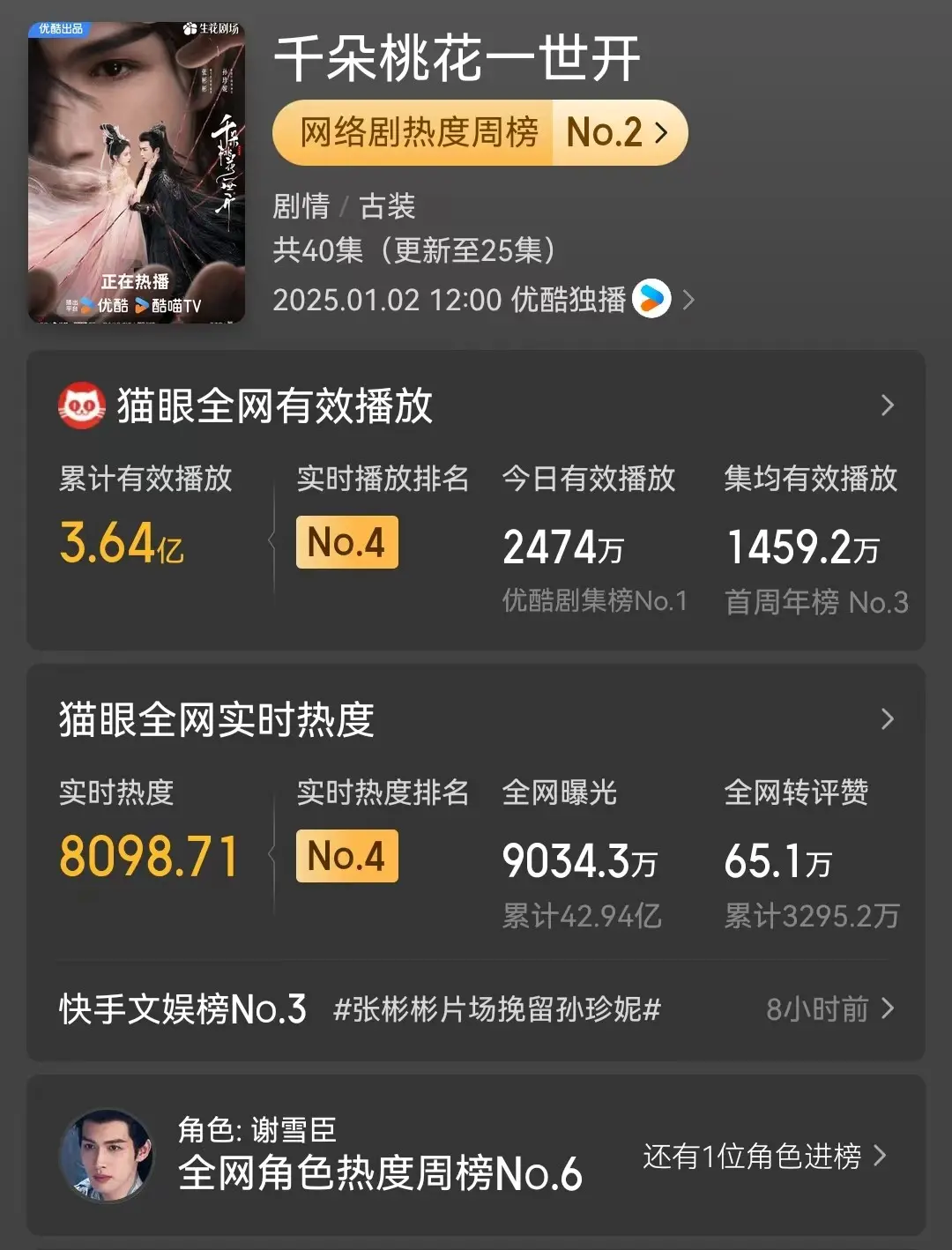 《千朵桃花一世开》这部剧讲述的故事可以说是相当高端,从上古开始,谢雪臣和暮悬铃之间的感情便开始了,而在无数年之后,两个人的感情再度出现,只是这一次,两个人之间却出现了身份上面的分歧,但是即使忘却前尘,正邪两立,两个人依旧彼此深爱着对方。整部剧在播出后不久就吸引了无数的观众,也让这部剧的网络热度快速增长,在排行榜上排名前列。